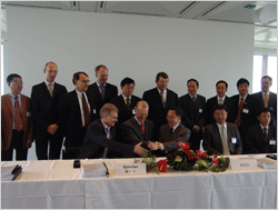 图为周其凤校长在吉大新材公司与德国德固塞公司股权转让与合资合作签字仪式上。